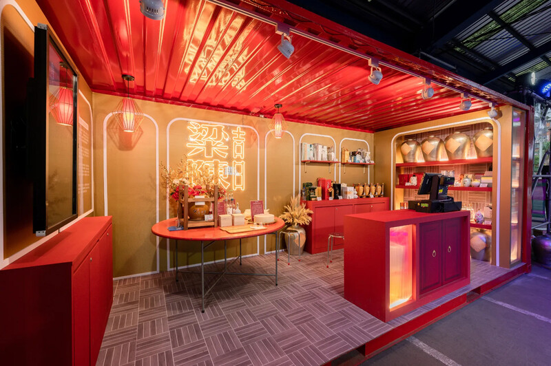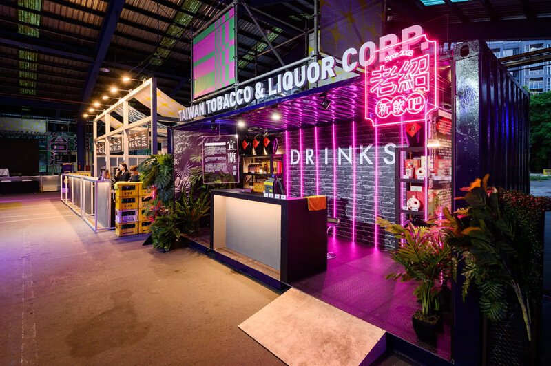 2023「台酒潮巷」活動體驗館,擷取臺酒主視覺的經典配色,透過色調偏移手法結合新潮元素進一步轉換層次,呈現出復古未來主義(Retro Futuristic)與賽博龐克(Cyberpunk)數位電子風格的即視感,在傳統與創新間激盪出火花,打造一條新台式潮流街道!