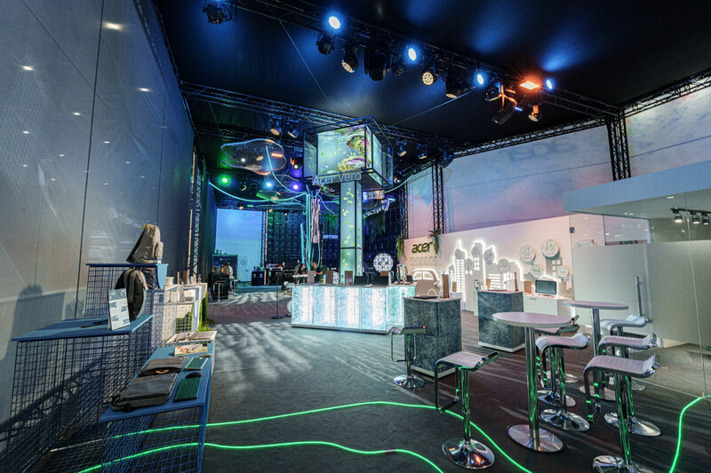 2023 年的設計上,也使用大量可重複利用之材料營造時尚環保的風格,利用不同層次素材的堆疊,將城市、智慧科技意象與綠植融入於一體呈現。在環保材料運用上,使用永生青苔打造有別以往的 Acer LOGO,並裝點在展示角落,懸掛裝飾取用廢棄漁網再製,植栽於展會結束後再培育生長。整體搭建材料重複利用率高達86%,並導入循環經濟的理念。經工研院統計,與木作裝潢設計相比減量達54%碳排放量,與客戶攜手傳遞ESG概念。