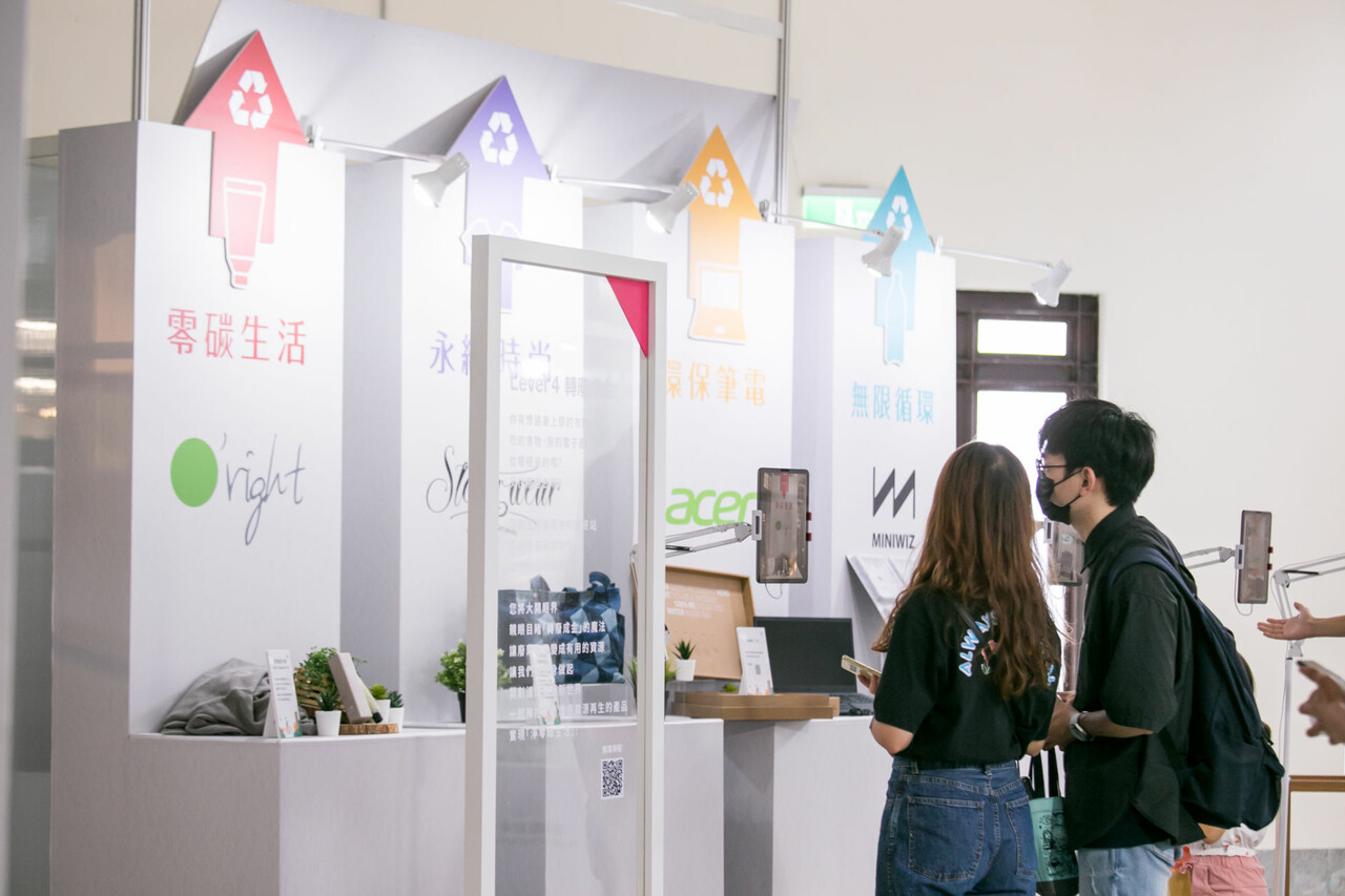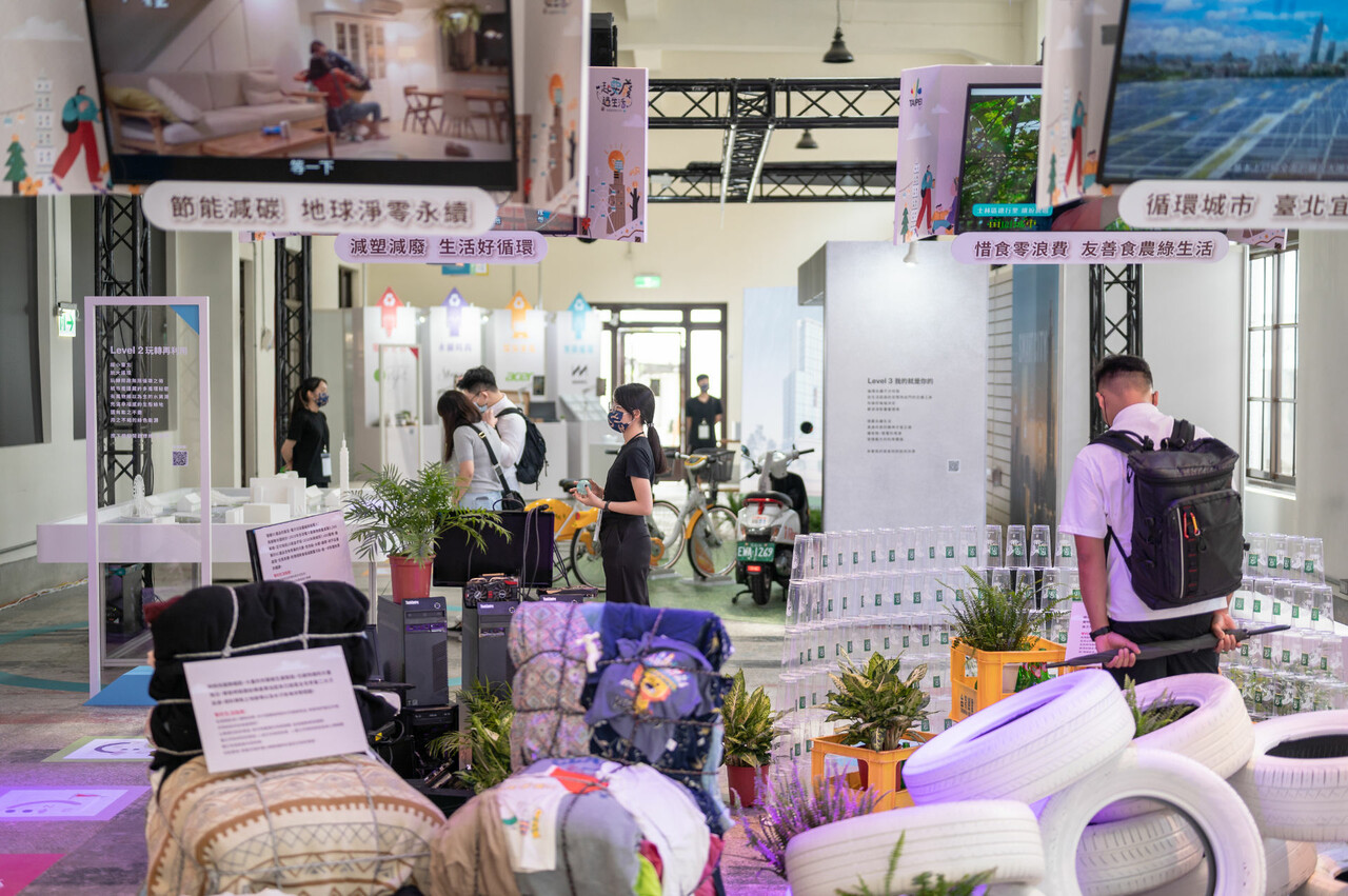 全場開採用數位虛擬集章的互動體驗手法,將展區內四大主題進行關卡分類,透過「闖關、破關、升等」的關卡設置,讓參觀者在展區內進行探索,蒐集循環生活的能力值,將城市議題與解決方案以科技互動的呈現方式,增加參觀者的參與度與認同感,提升參觀者對於永續生活的質量,進而達到政策宣導、永續生活與綠色消費的推廣。